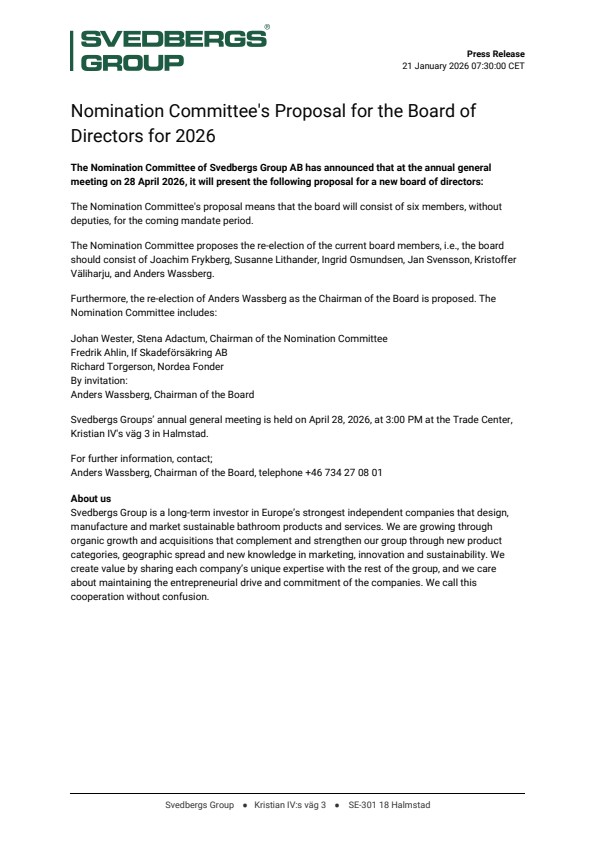 The Nomination Committee of Svedbergs Group AB has announced that at the annual general meeting on 28 April 2026, it will present the following proposal for a new board of directors: