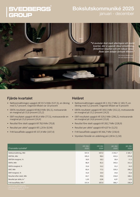 This information is information that Svedbergs Group is obliged to make public pursuant to the EU Market Abuse Regulation. The information was submitted for publication, through the agency of the contact persons set out above, at 2026-02-04 07:30 CET.